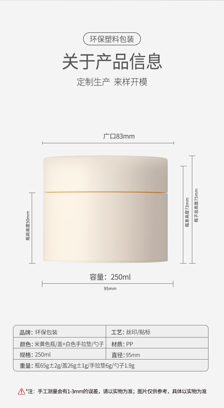 • 現(xiàn)貨250ml米黃色圓柱廣口瓶PP磨砂膏瓶身體乳去角質(zhì)火山泥面膜罐,磨砂膏、發(fā)膜、焗油膏、膏霜罐、身體乳、去角質(zhì)、面膜、火山泥等
