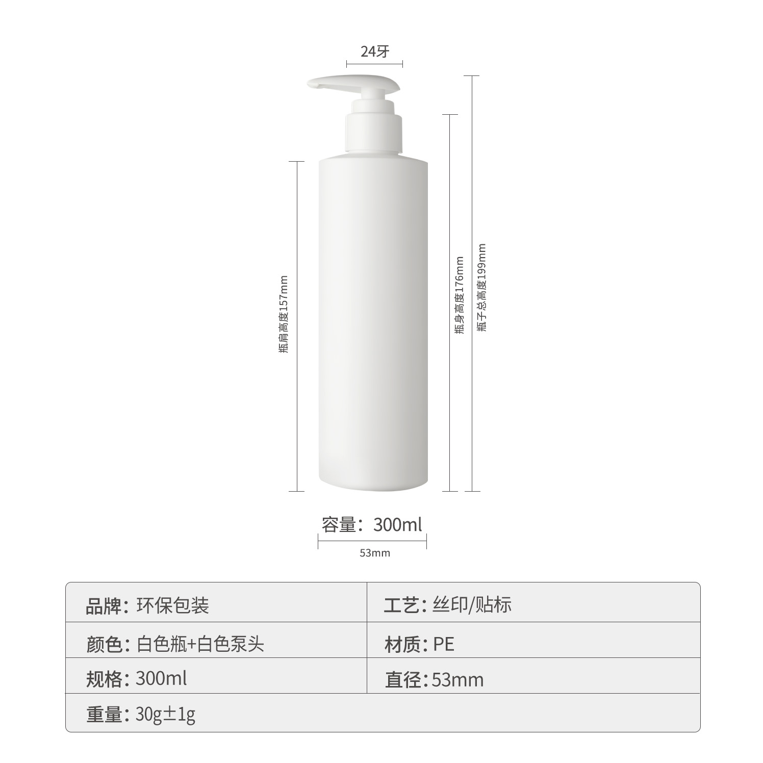 • 現(xiàn)貨300ml白色平肩圓柱瓶洗衣液身體乳通用分裝瓶HDPE洗護(hù)瓶包材,洗發(fā)水、沐浴露、護(hù)發(fā)素、身體乳、洗衣液等